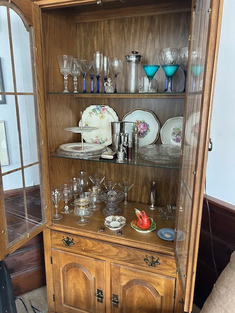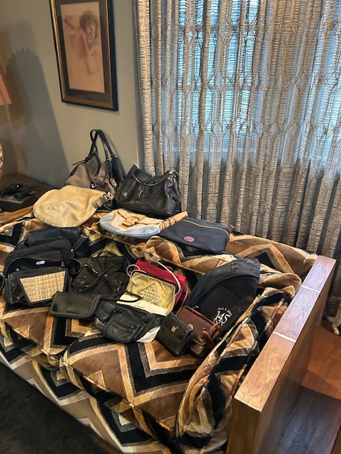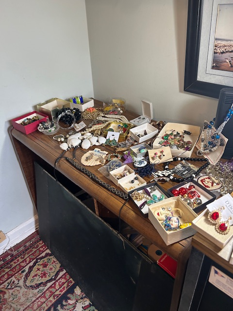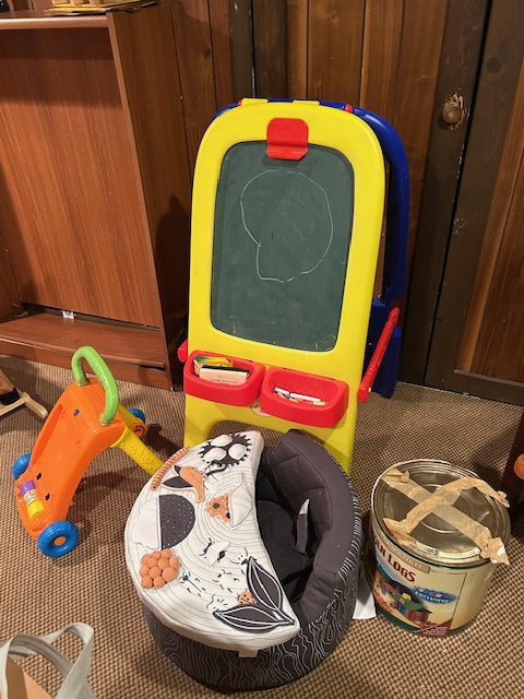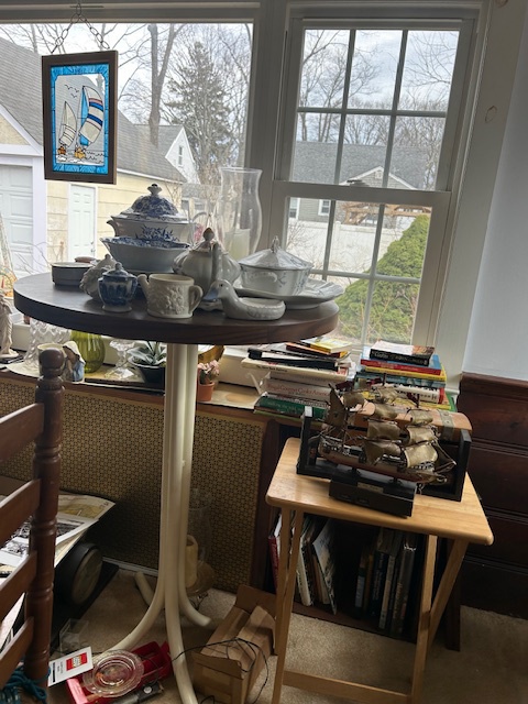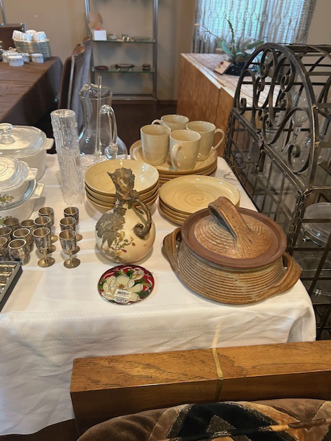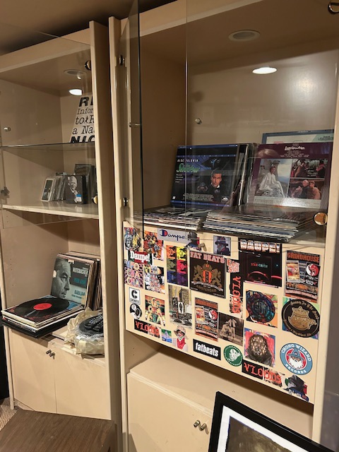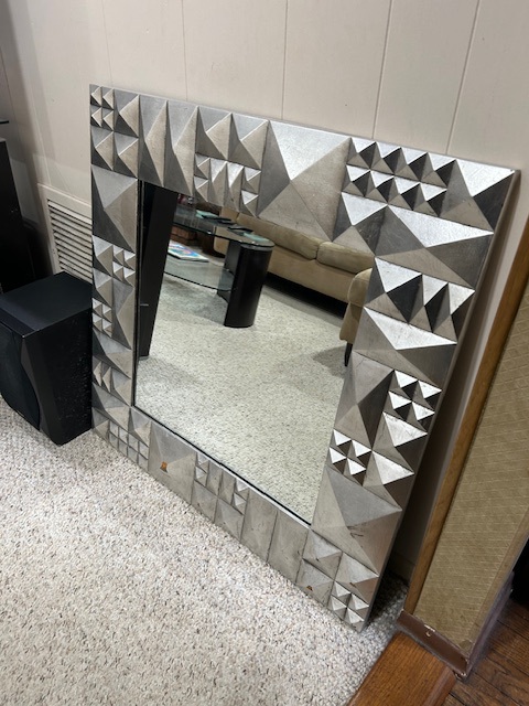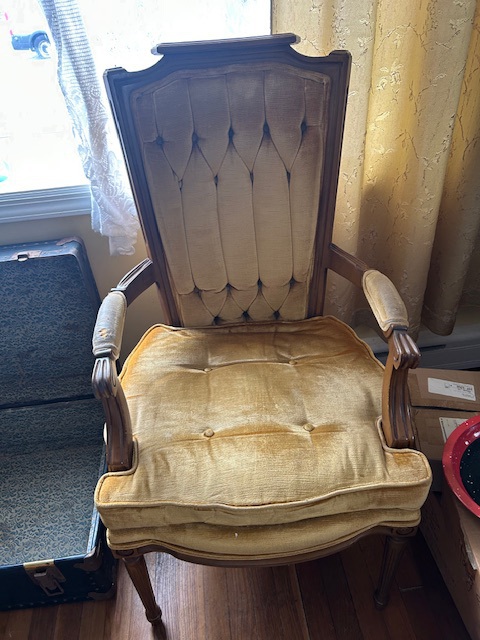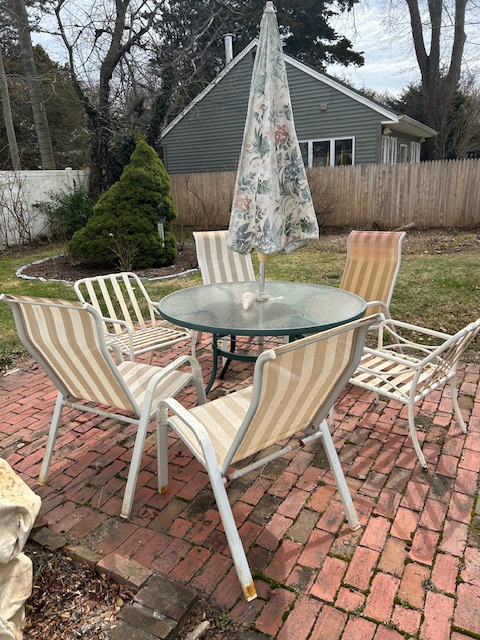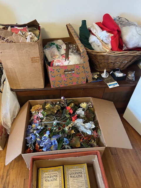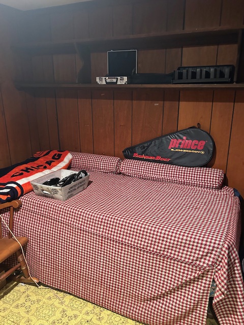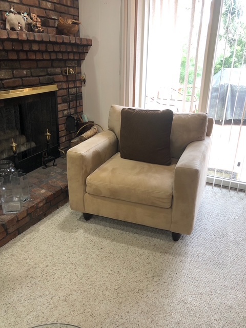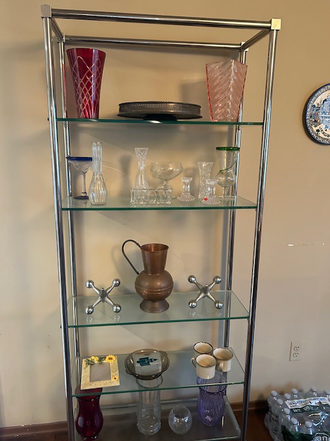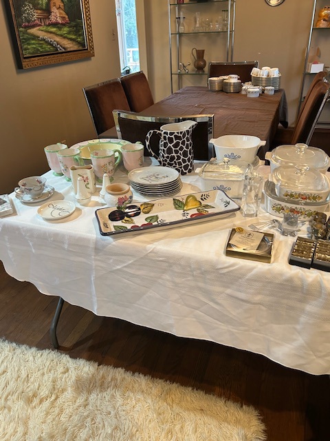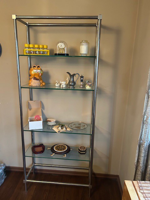 Bauman style chevron patterned velvet sofa & loveseat, shag rug, modern Tronchi glass tube chandelier, mica dinette with 6 upholstered Breuer style chairs, pair of chrome & glass etageres, chrome and white glass globe atomic style fixture, brown velvet chrome plated dining room chairs set of 6, orange upholstered side chair, coffee table, upright piano, desks, dressers, grey mica bedroom furniture, geometric mirror, bags, costume jewelry (not pictured), set of Ginori china, bric-a-brac, kids toys, records, some sports, loads of books, kitware, outdoor table with 6 chairs and umbrella & more