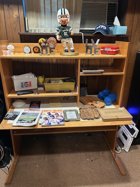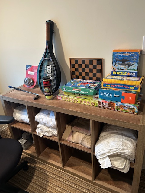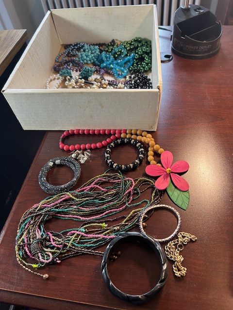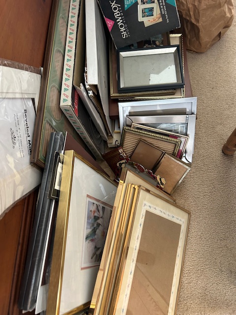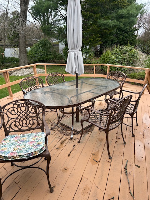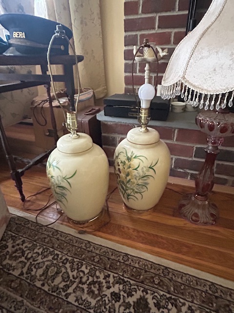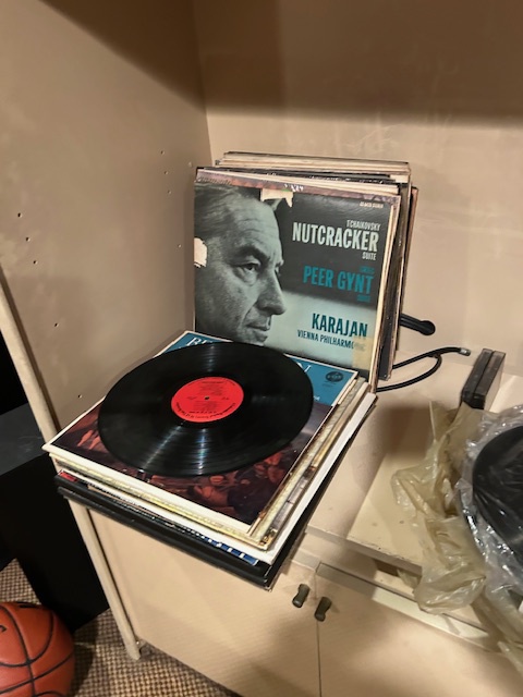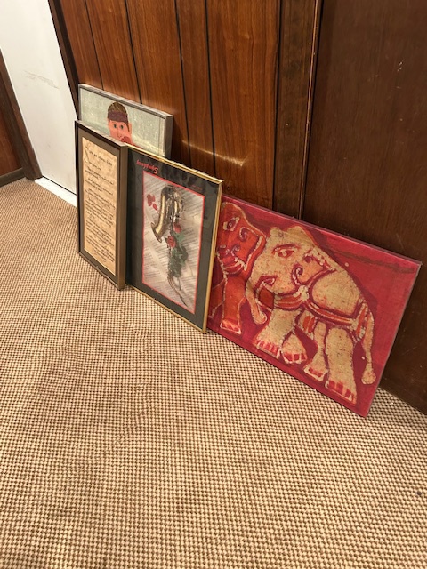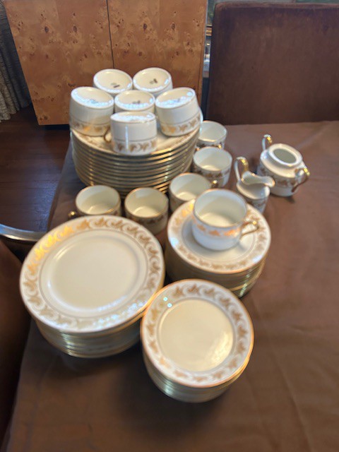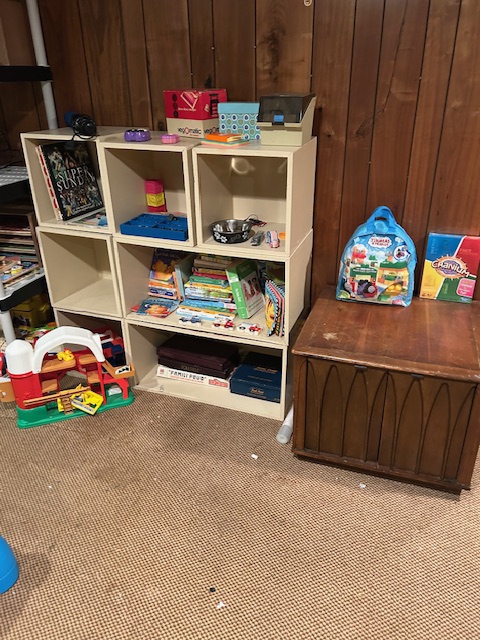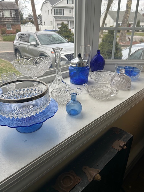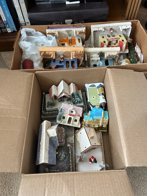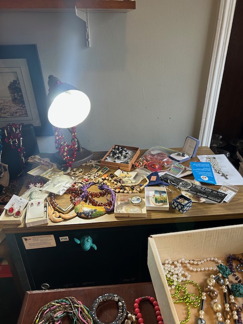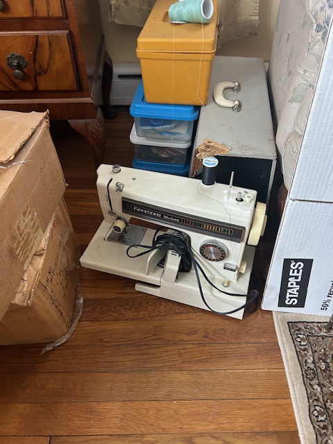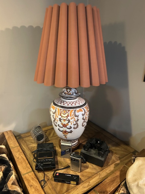 Bauman style chevron patterned velvet sofa & loveseat, shag rug, modern Tronchi glass tube chandelier, mica dinette with 6 upholstered Breuer style chairs, pair of chrome & glass etageres, chrome and white glass globe atomic style fixture, brown velvet chrome plated dining room chairs set of 6, orange upholstered side chair, coffee table, upright piano, desks, dressers, grey mica bedroom furniture, geometric mirror, bags, costume jewelry (not pictured), set of Ginori china, bric-a-brac, kids toys, records, some sports, loads of books, kitware, outdoor table with 6 chairs and umbrella & more