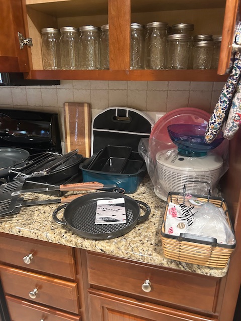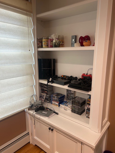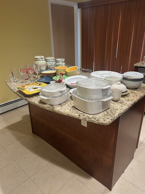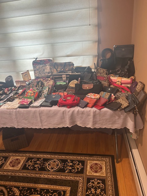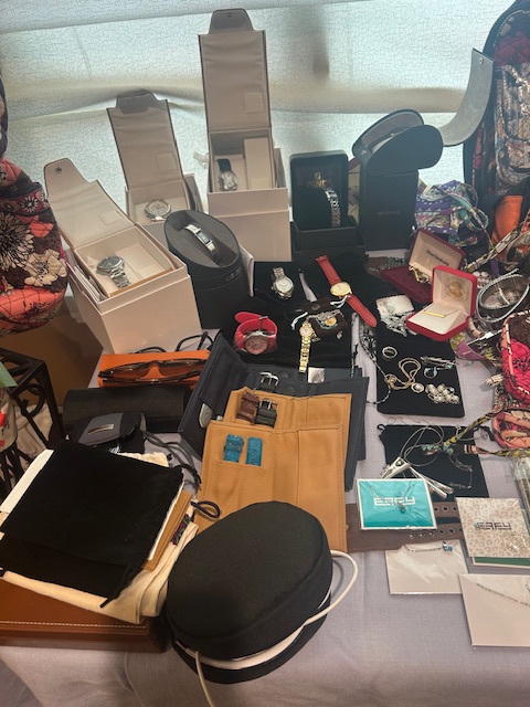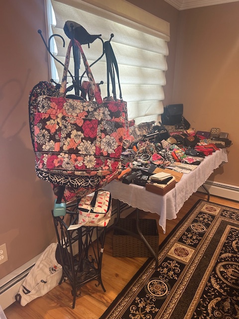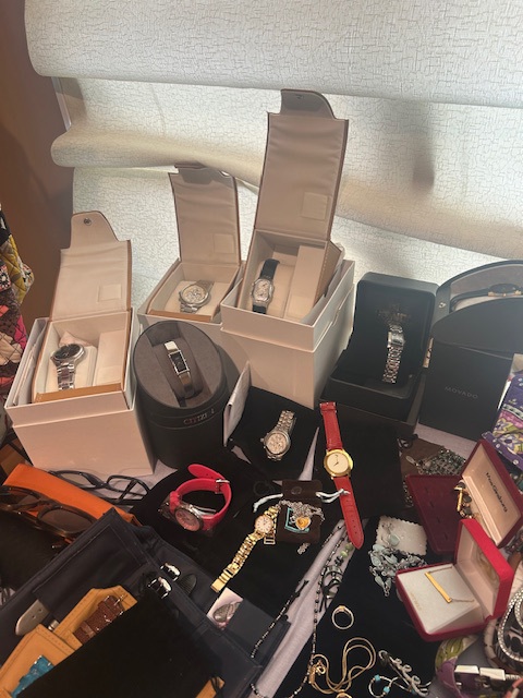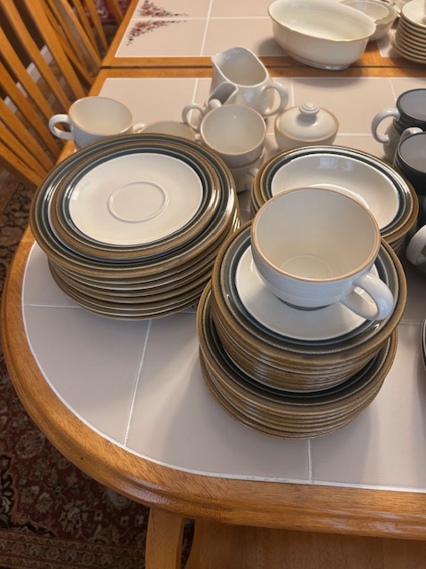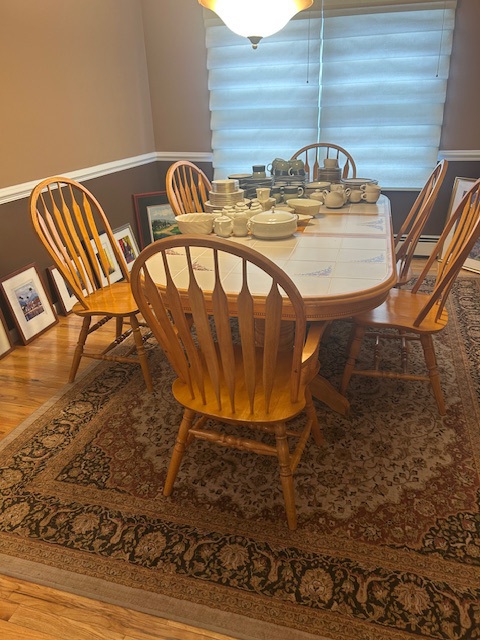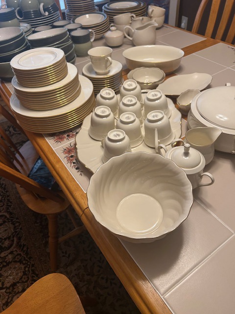 Beautiful dining room table, 6 chairs and matching china closet, tile top kitchen table & chairs, 6 drawer chest of drawers, sofa, armoire, leather reclining sofa with matching chair, 5 piece master bedroom set, white washed 4 poster bed with matching armoire, coffee table, mirrored wardrobe, twin bed, computer desk, PS4, PS3, WII and lots video games, costume jewelry, watches, George Jensen sterling Harlequin forks and spoons, men's clothing, belts, ties, loaded with vintage Coach bags, set of Lenox "Sand Dune" china, crystal, prints, rugs, kitware, bar needs, loads of CD's and DVD's, bedding, golf clubs, games, cordless blower, garden tools and more!